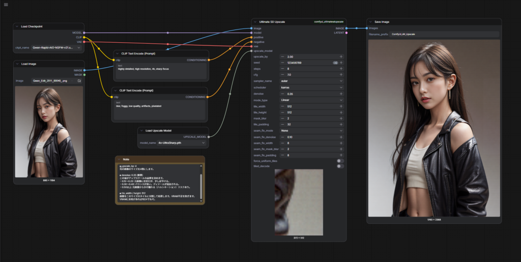 Gemini 3.0 Pro で「Ultimate SD Upscale」のワークフローのJSONファイルを生成しました。しかし、パラメータの初期設定が不適切でノードがレッドシグナルで進みませんでした。改めて、推奨のパラメータ設定値を調べて、アップスケールできました。